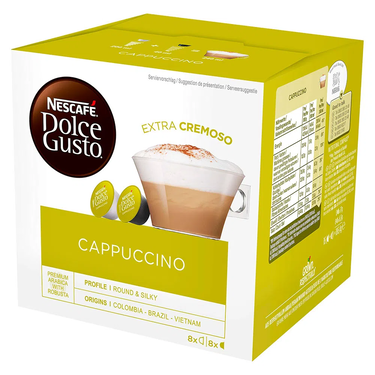 Découvrez ces capsules Nescafé Dolce Gusto Cappuccino composées de café corsé (x8 capsules) et de lait entier en poudre sucré ( x8 capsules). Conditionnement : boîte de 16 capsules.